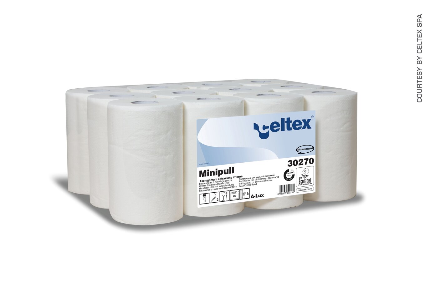 - Celtex MINIPULL – Mini papírové ručníky v roli, centrální odvíjení, 2vrstvé, 100% celulóza, 72 m (12 rolí)