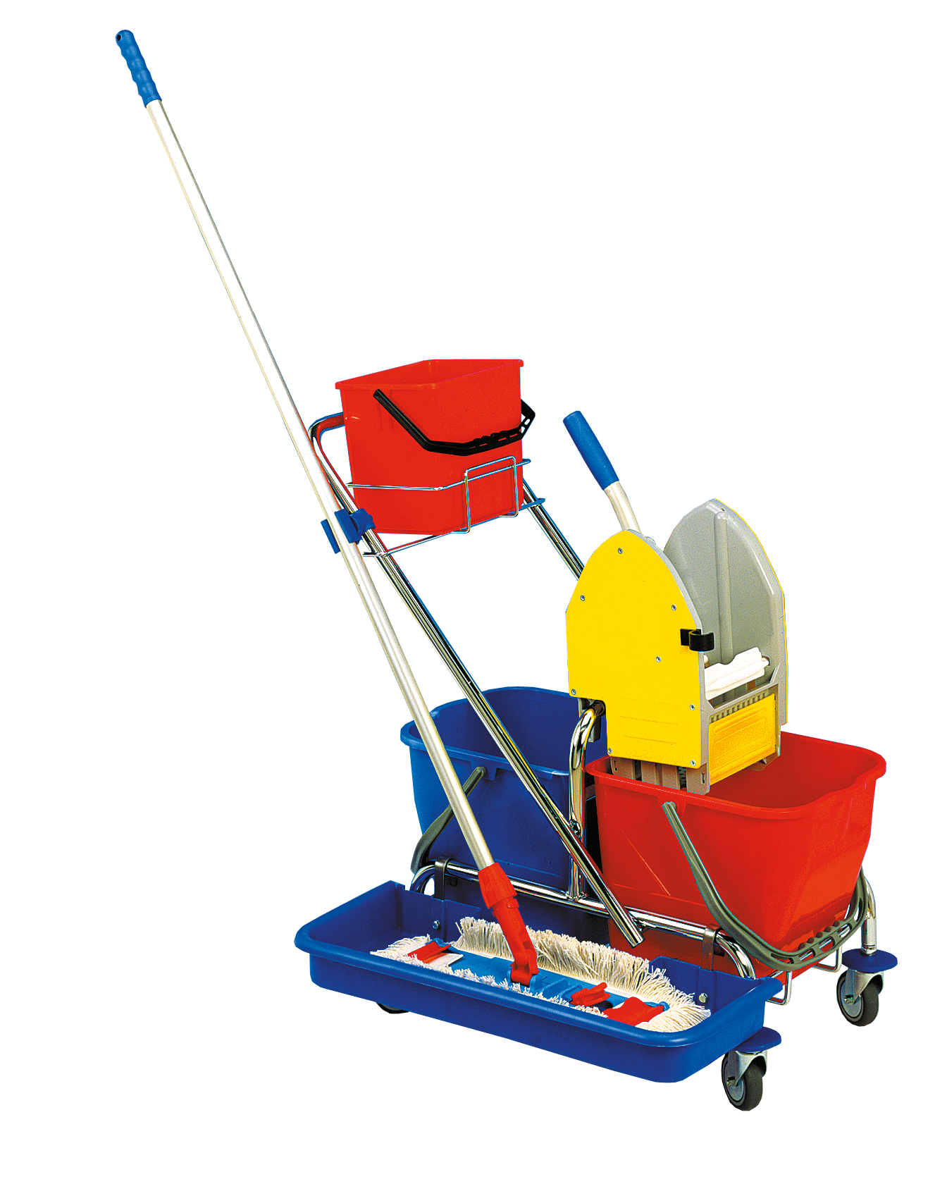 V ceně vozíku: 2 kbelíky 17 l, kbelík 6 l, košík na kbelík 6 l, ždímač, plastová podpěra, držák tyče alu.