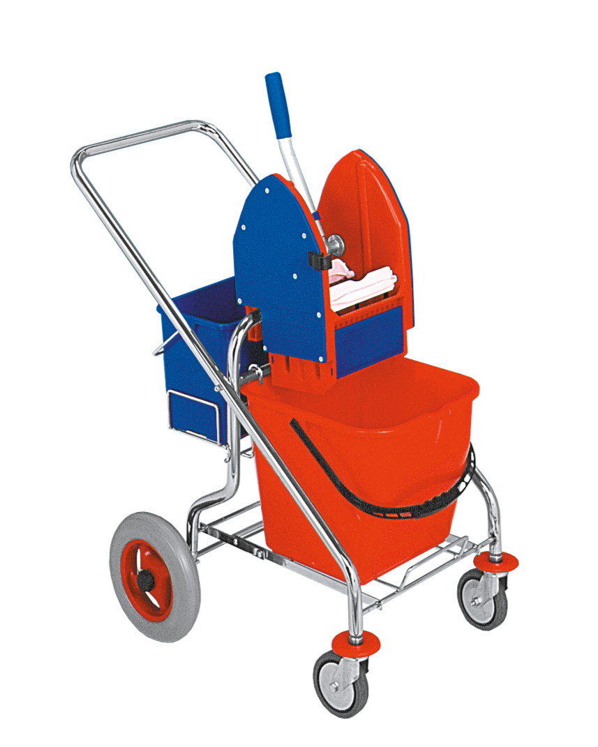 Profesionální pochromovaný sklapovací jednokbelíkový úklidový vozík na kolečkách se ždímačkou a kbelíkem o objemu 17 l. Vylepšen většími zadními kolečky pro snadnější zdolávání nerovností nebo malých schodů.