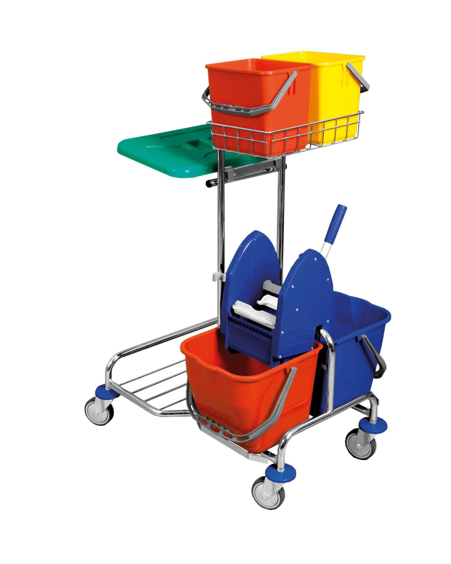 Kovový, pochromovaný vozík řady Piccolo v různých obměnách splňuje požadavky na plnohodnotný úklid podlah, sběr odpadků a mokrý úklid povrchů.
