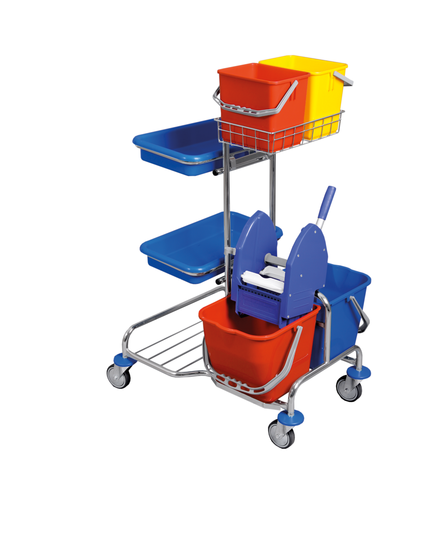 V ceně vozíku: kovová konstrukce na kolečkách pr. 100 mm, 2x držák vaničky Kombi, 2x vanička Kombi, 2x kbelík 17 l, ždímač, koš 2x6 l, 2x kbelík 6 l