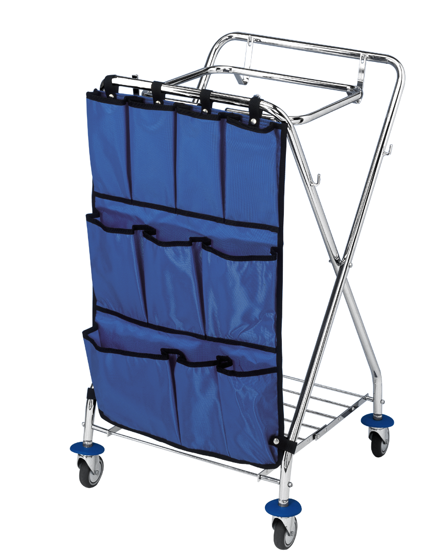 Textilní kapsář pro různé potřeby, které běžně pracovníci úklidu používají. Zavěšuje se pomocí patentů na kovovou konstrukci X vozíku.