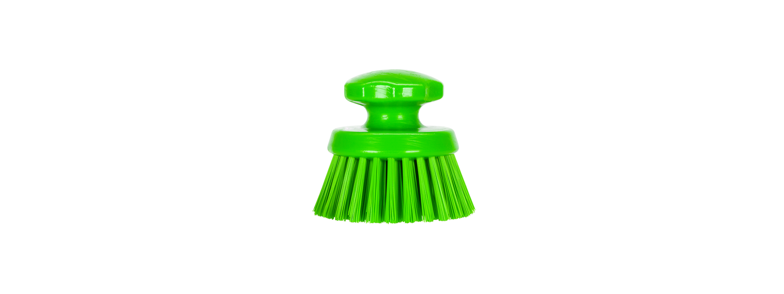 Praktický kartáč Kobra kulatý, ruční, tvrdý. Kartáč na dřevěné či plastové desky, špalky na maso atd. Na středně až velmi odolnou špínu, na hladký až drsný povrch. Průměr 9 cm.