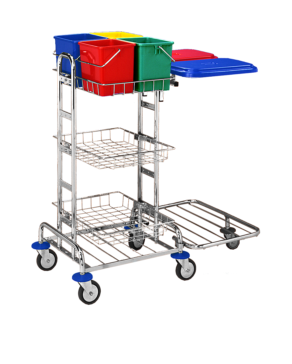 Kbelíky slouží k mytí povrchů, oken atd. Kbelíky 6l jsou v ceně vozíku. K vozíku jsou přidány 2 držáky pytle 70 l se sponkami na pytel, víka 70 l a rošt s kolečky.