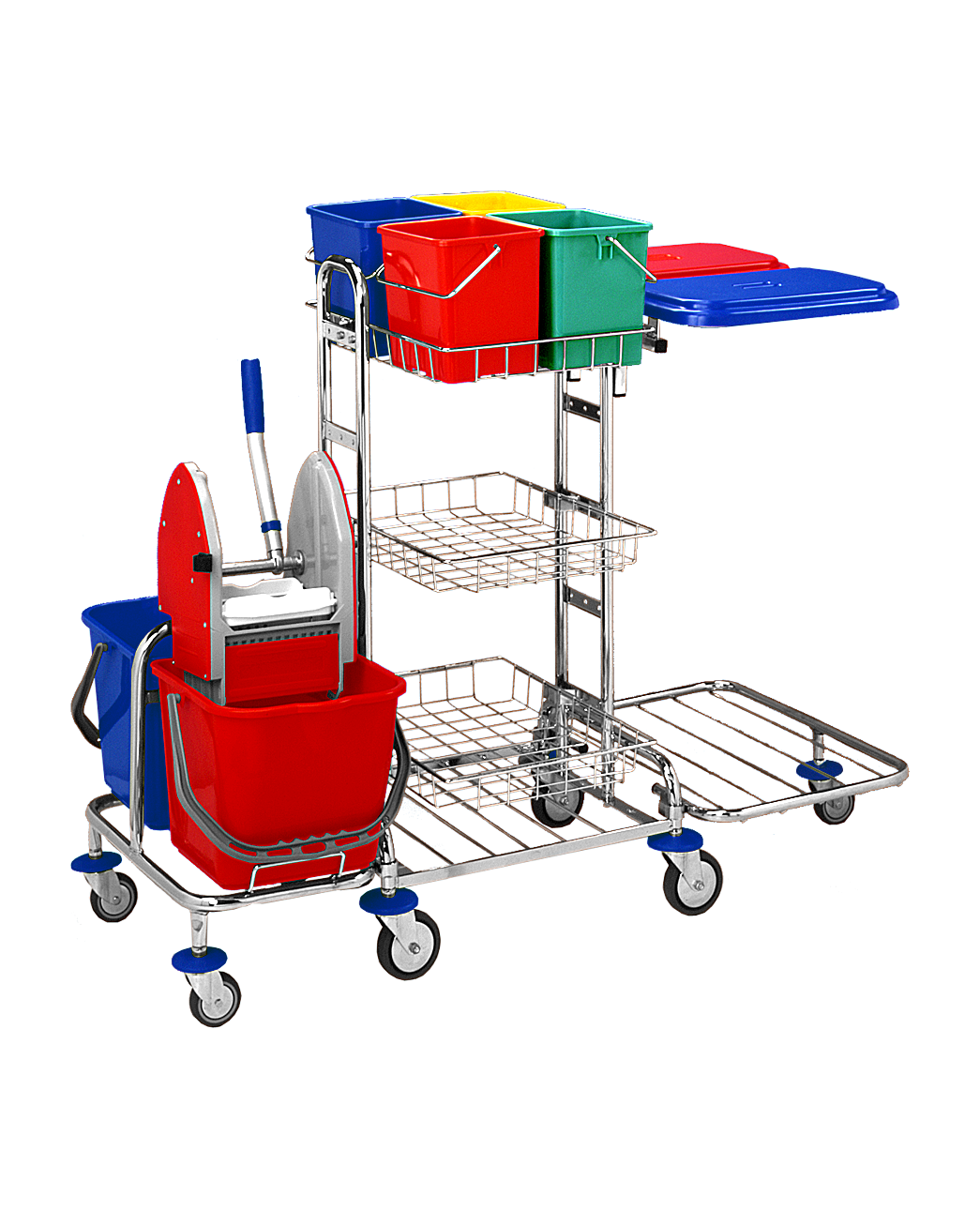 Kbelíky slouží k mytí povrchů, oken atd. Kbelíky 6l jsou v ceně vozíku. Na jedné straně vozíku jsou dva pytle 70 l i s víkem v ceně a z druhé strany vozíku je mycí sada se 2 kbelíky 17 l a ždímačem SPL.