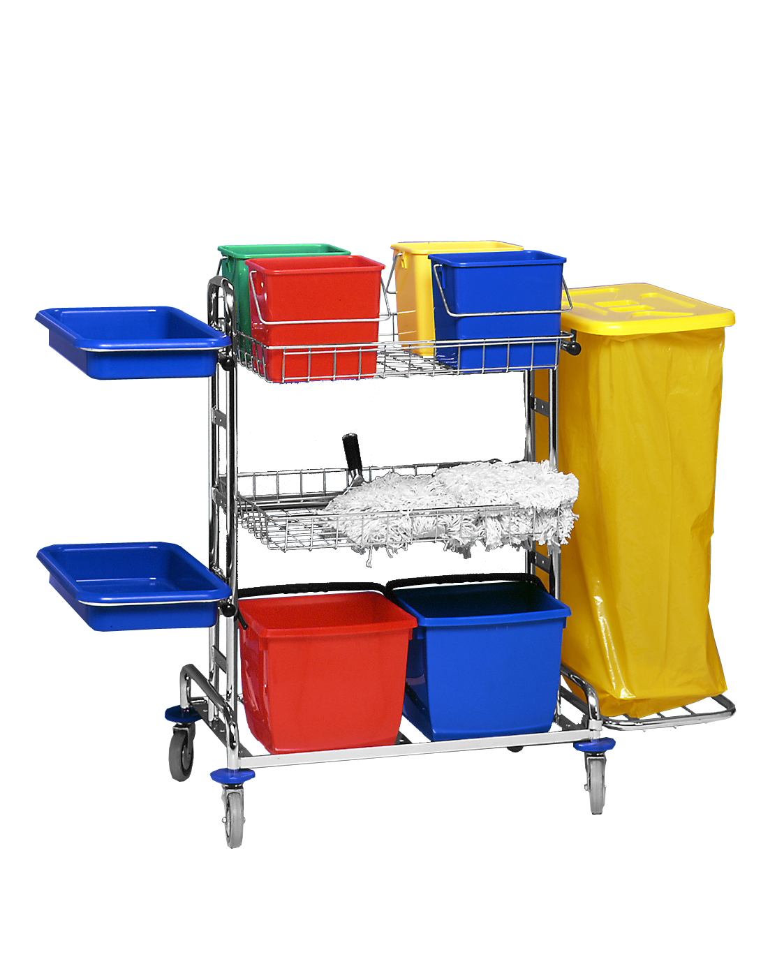 Kovová pochromovaná konstrukce vozíku je vybavena na jedné straně 2 držáky s vanou a na druhé straně pytlem 120 l. Na vozíku jsou 2 široké koše, kde je možno skládat lůžkoviny, ručníky, hadříky apod. Vozík nabízí možnosti umývání různých povrchů a sanity.