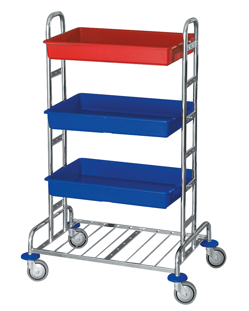 Základní jednoduchá konstrukce na odkládání do plastových van. Lze rozvážet prádlo, povlečení, nádobí apod. Plastové vany Kombi Maxi mají rozměr 40x63 cm, výška 8 cm. Vozík má vyvýšená šestipříčková madla. Dle přání lze na bok vozíku přidat držák pytle nebo vany Kombi.