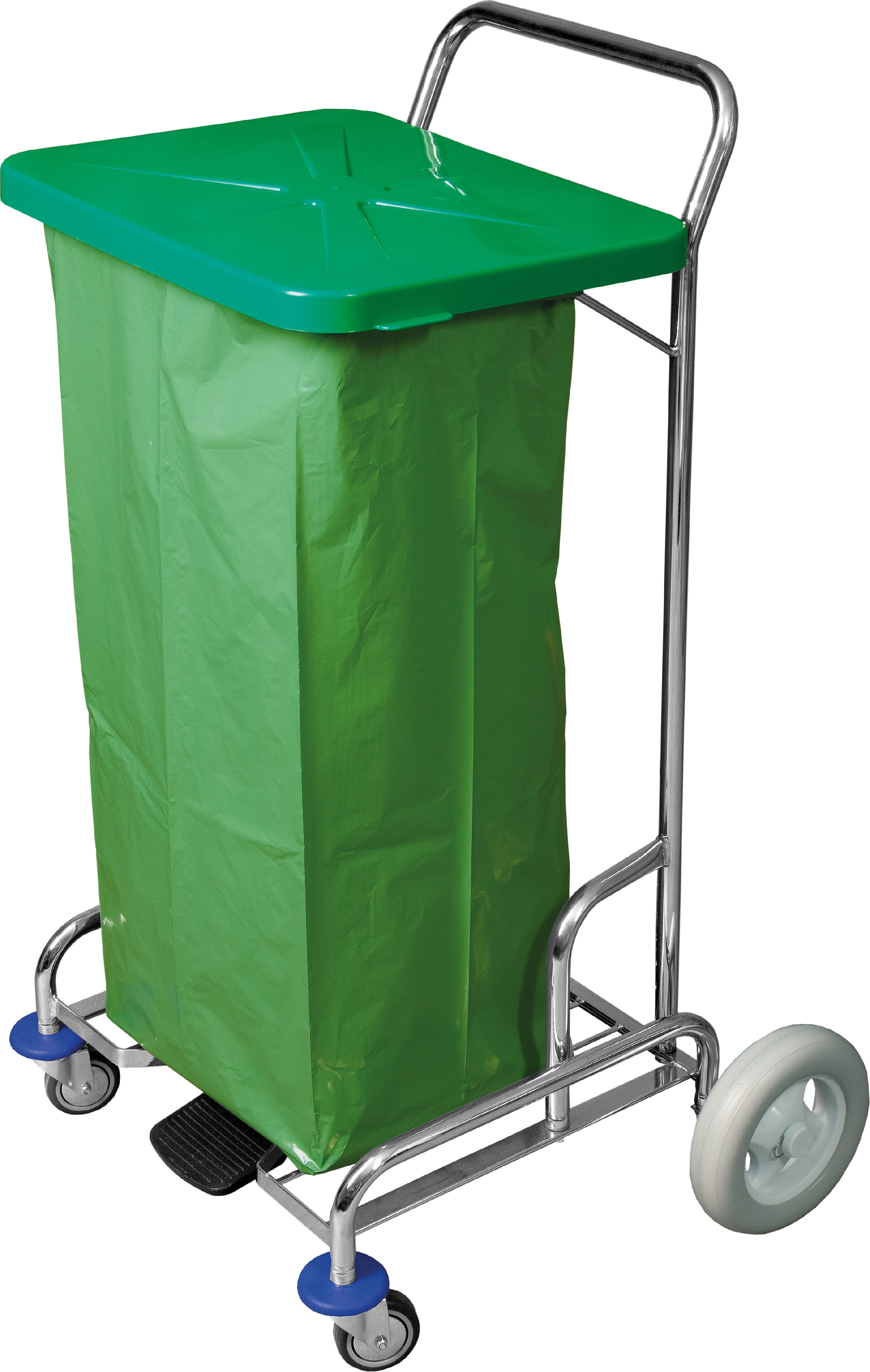 Vozík na odpad ovládaný nožním pedálem. Podvozek je osazen kolečky pr. 75 mm a kolečky pr. 220 mm, díky kterým je vozík schopen přejíždění po schodech. Velice pohodlné ovládání nohou bez nutnosti dotýkat se víka rukou. Slouží k instalaci pytle 120 l. Na držáku pytle jsou 3 spony na pytel. Igelitový pytel není v ceně.