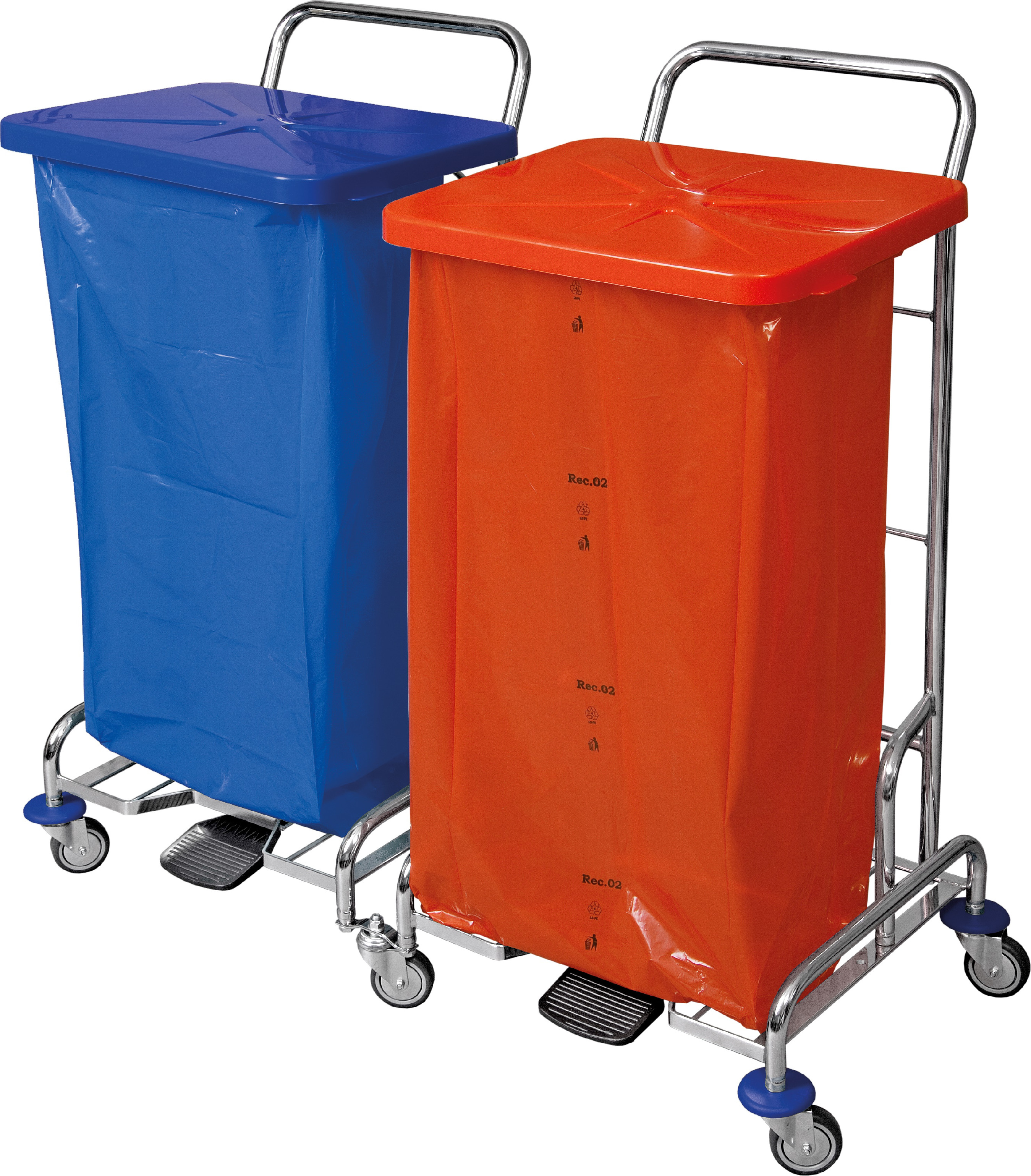 Vozík na odpad ovládaný nožním pedálem. Podvozek je osazen kolečky pr. 75 mm. Velice pohodlné ovládání nohou bez nutnosti dotýkat se víka rukou. Slouží k instalaci pytlů 120 l, ale lze objednat i jako variantu na pytle 70 l. Případnou preferenci prosím zapsat do poznámky. Na každém držáku pytle jsou 3 spony na pytel. Igelitový pytel není v ceně.