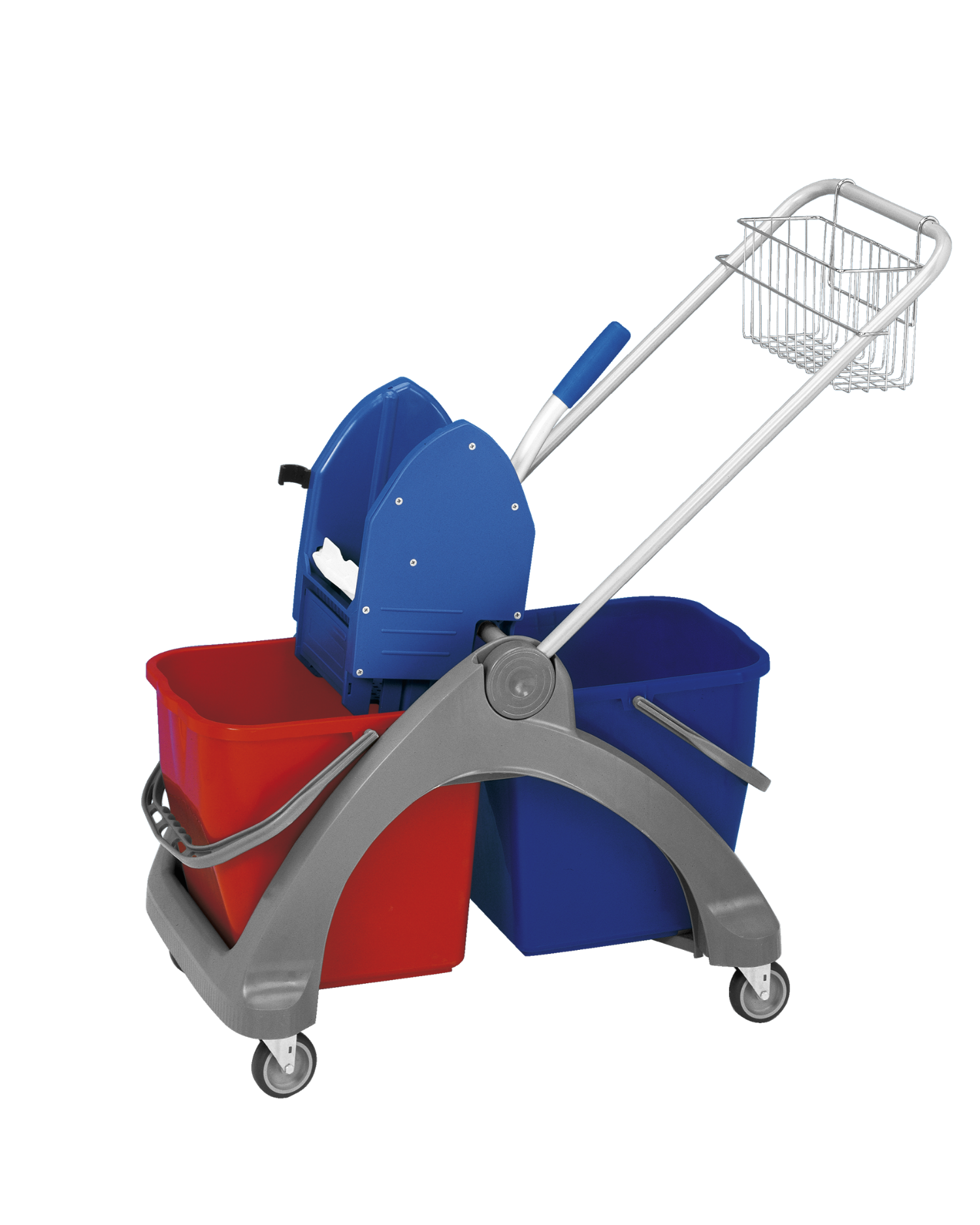 Plastový vozík s 2 kbelíky 25 l a ždímačem. Napevno nasazená kolečka. Vodítko je hliníkové.