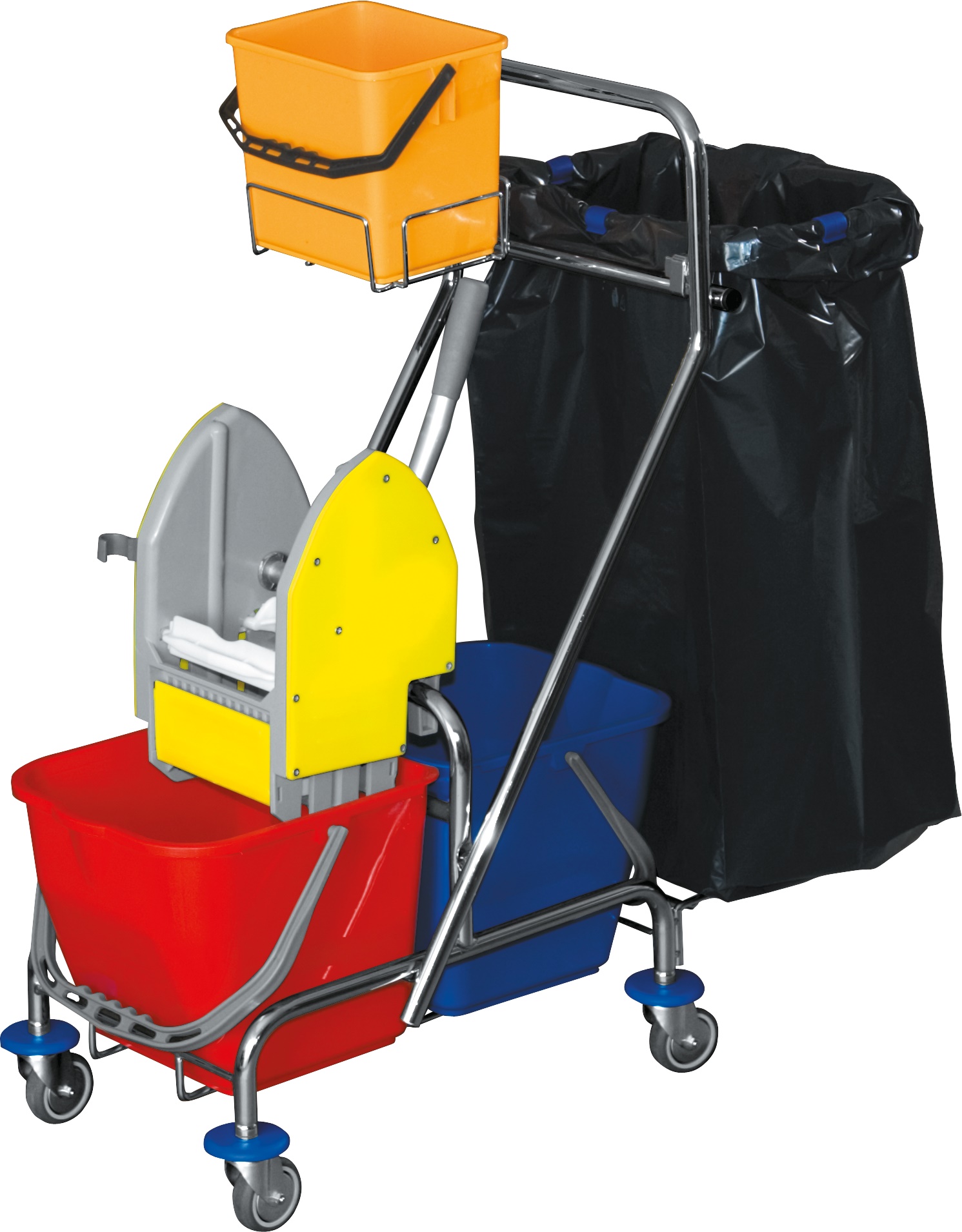 V ceně vozíku: podvozek s vodítkem, rošt pod pytel, držák pytle, 3x svorka pytle, 2x kbelík 17 l, ždímač, koš otočný pravý, kbelík 6 l